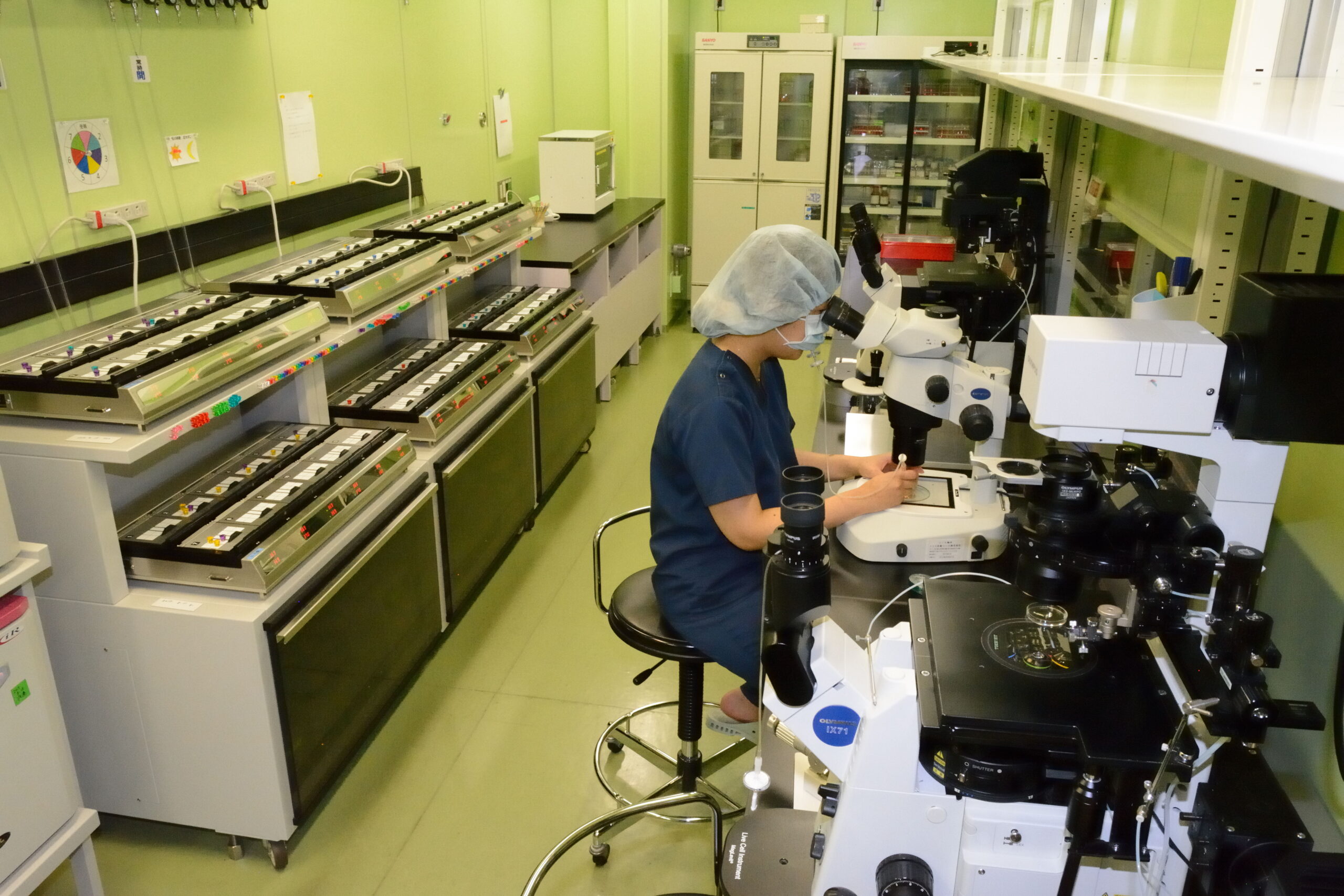 ここで卵子を受精させ、着床する直前の状態の胚盤胞まで培養を行います。また、発達した胚盤胞の凍結保存も行っています。卵子が発達するのに適した環境を維持するために、光、温度、湿度をコントロールし、清潔度を保つためにクリーンルームとし、外部から独立した設計となっています。