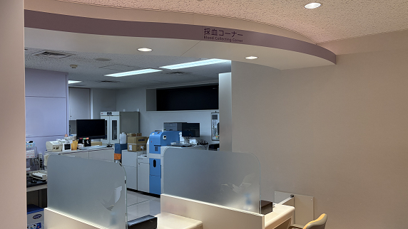 検査室に隣接し、採血コーナーがあります。採血した後、すぐに検体を検査室にて検査いたします。