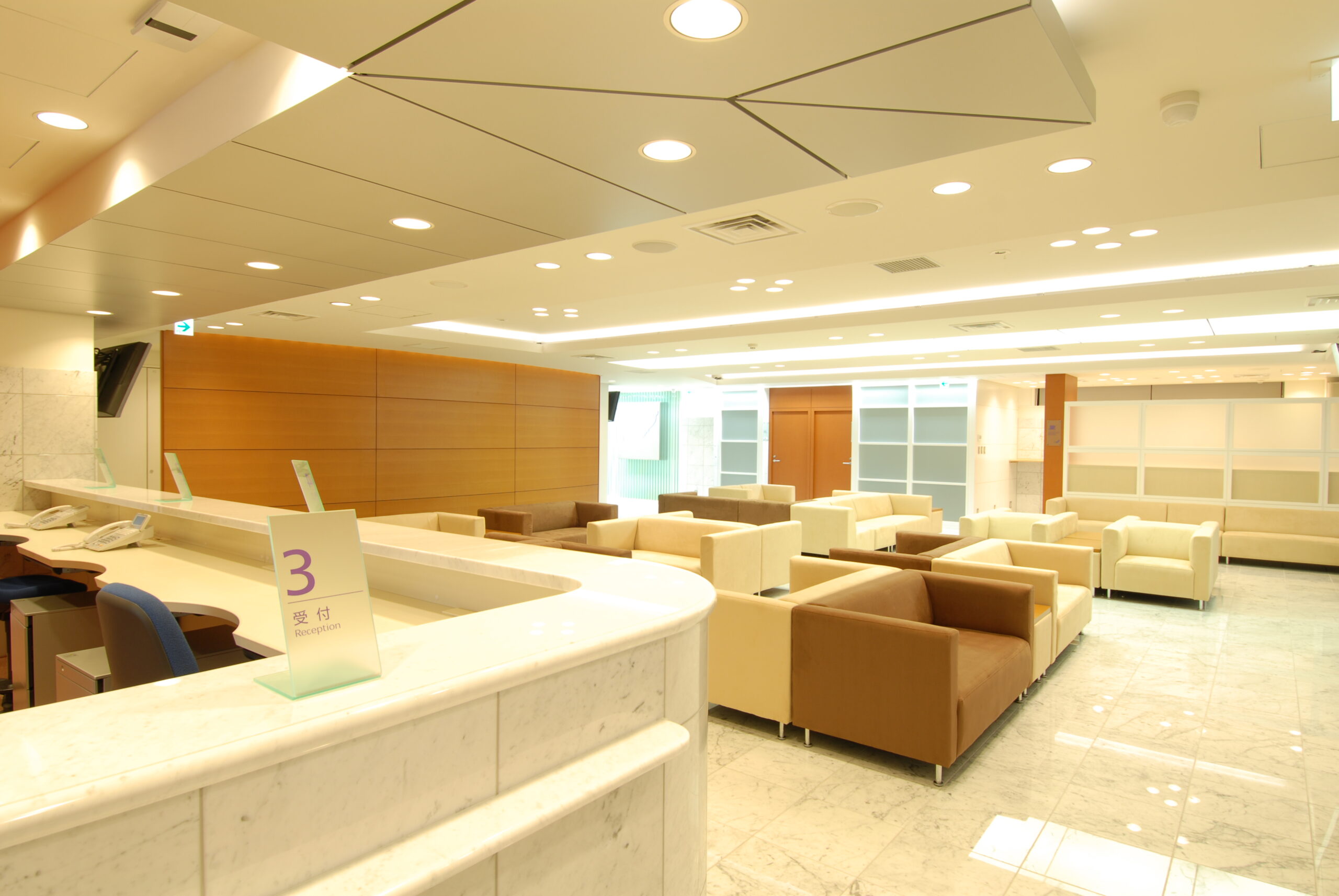 3階の総合受付・待合ロビー。初診の方、採卵・胚移植の方は受付窓口にて受付して頂きます。再診の方はこちらの再来受付機で受付して頂きます。受付の後は、呼び出しモニターに番号が出ますので、各フロアに移動していただきます。