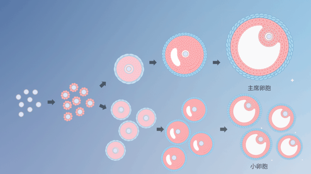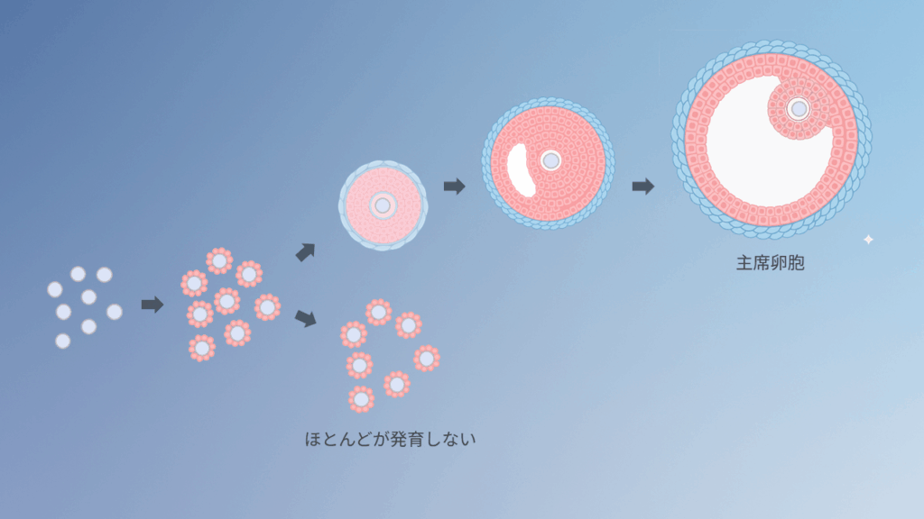 その中からひとつだけが特に大きく成長して「主席卵胞(しゅせきらんほう)」となります。